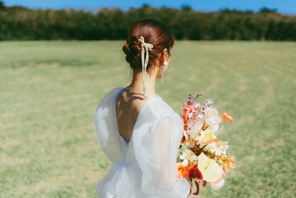 後ろ姿では、背中側でリボン結びをするデザインのため、オーガンジーのリボンがロケーション撮影では風に美しくなびきます。シアーな素材越しに見える背中のラインがとっても綺麗でバックコンシャスなアイテムです。