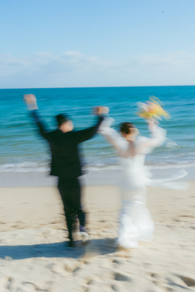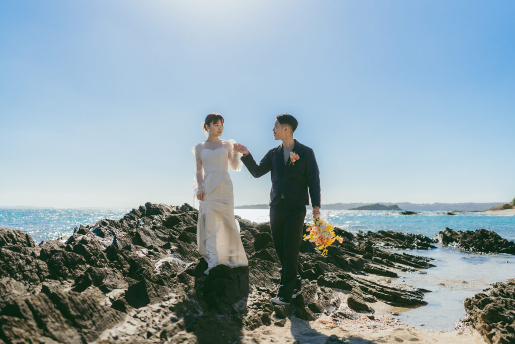 装飾が控えめな分、シルエットの美しさが際立ちます。カジュアルな雰囲気のビーチフォトでも浮くことなく、”やりすぎない”華やかさも演出。