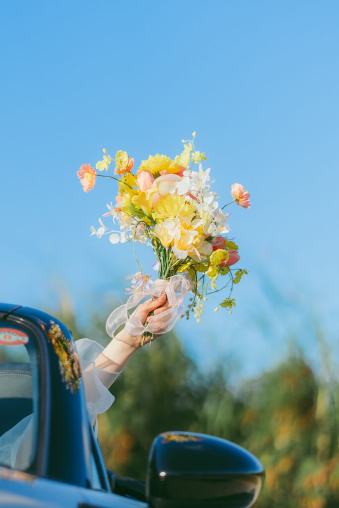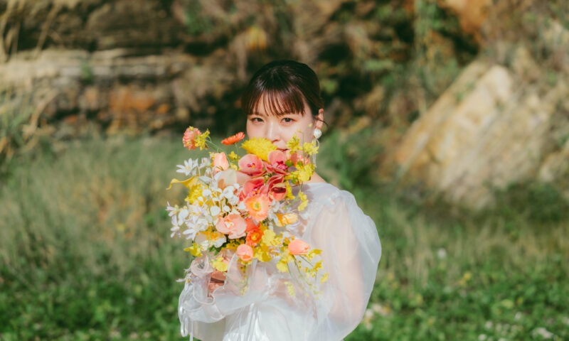 ドレスがシンプルで透明感があるため、オレンジやイエローを基調とした鮮やかなブーケが鮮明に映えていて素敵です!ドレスがシンプルであることは他のアイテムを引き立ててくれます♡